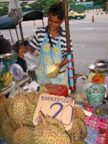 よく見てみると、かなりの人がそれを食べており、もっとよく見ると店の入り口にはキャンペーン旗も立っている! ヨッしゃこれを注文と言うことでカウンターへ向ったものの、アルバイト姉ちゃんの完璧なるタイ語攻勢に、こちらとしては指差し確認状態でなんとか物を手に入れることができた。 セットは白いタイ米にあんかけタレがかけられたものとチキンが1ピース、サラダも載って日本円で約100円。ドリンクつきでも140円くらいであった。 ケチャップの容姿をしたタイ風調味料もかなり怪しいものがあった。 食後はスターバックスのアイスコーヒーを片手に休憩コーナーのイスに座って人の流れをぼんやりと眺めていると、家路を急ぐOLや夕食の特価品を調達する主婦たち、学校帰りのアベックや、靴屋のショーウィンドーを眺めている若者たちで午後5時を過ぎた街もにわかに忙しくなってきていた。 そろそろバンコクともお別れだ。ショッピングセンタ−から外に出ると帰宅を急ぐ庶民でバスターミナルも大騒ぎ。我々は人の波に押されながら露天商が両側にある狭い通路を大通りに向かった。 歩道橋を渡り、ある一軒の果物やさんの屋台の前で、ドリアンを見ていると先客のオヤジが日本人かと話し掛かけてきた。 このオヤジは日本とタイで旅行関係の仕事をしていると言う話をしながら、時折果物屋のお姉さんに的確に指示を飛ばしドリアンを切らせていた。 「どうだ君らも食うのか?」オヤジは言った。 一度は食べてみたかった果物の王様ドリアン。 加工食品では幾度となくお目にかかっているが、本物とのご対面はこれが初めてである。