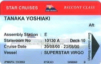 キャビンカ−ドについて 船内はすべてキャッシュレス。 乗船と同時に左のような素敵な名前入りのカ−ドが 渡される。 これは、ドア−のキ−であり、船内で買 物をするときのクレジットカ−ド的な働きもする。 さらに、パスポ−トや寄港地のビザも兼ねていて、 まさにス−パ−スタ−・ヴァ−ゴのス−パ−・カ−ドだ! 無くしたら大変だから管理だけは慎重に。 今回はこのカ−ドに、300シンガポ−ルドル分の飲 食無料得点もつけてくれました。 ラッキ--!! |