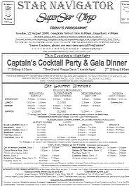 船内の催しとオプショナルツア−について 船内では毎日毎日いろいろな催しが行われています。 前日の夜にはベットメイクとともに船内新聞が配達されます。 英語版で配られますが、日本人のスタ ッフも何人か乗船している為、しばらくすると日本語版も配られます。有料のものもありますが、 無料のものでもかなり楽しめます!楽しそうなイベントにはチェックをお忘れなく! オプショナルツア−には定員があります。 これはバスや島などに上陸するためのものでしょうが、 人気のあるものは一杯になってしまう可能性がありますので、乗船したらお早めに予約しましょう。 また、特別晩餐会のガラパ−ティ−の座席予約もお早めに。 寄港地の通貨については、船内で両替が可能です。 クレジットカ−ドで買物は用が済みますの で、お小遣い程度(2千円〜3千円)で充分でしょう。 |